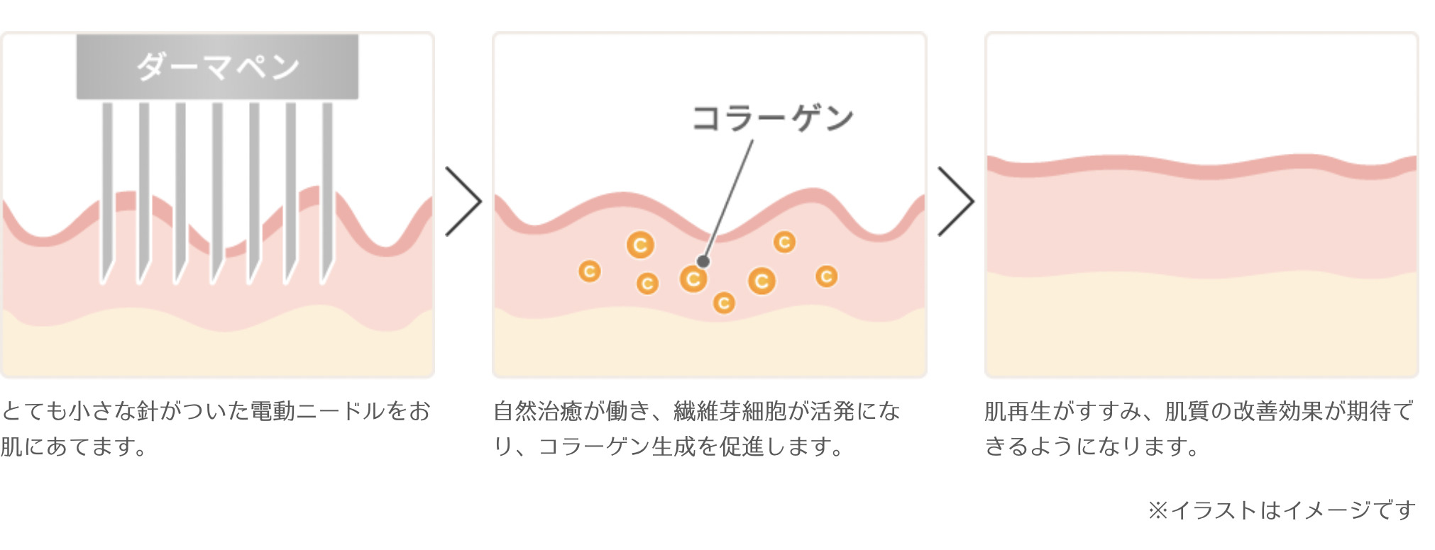 私達のお肌には、傷がついたら修復して元に戻そうとする力が備わると言われています。その力が働くとお肌の生まれ変わりが速くなるので、その力を利用した施術がダーマペンです。[/box]