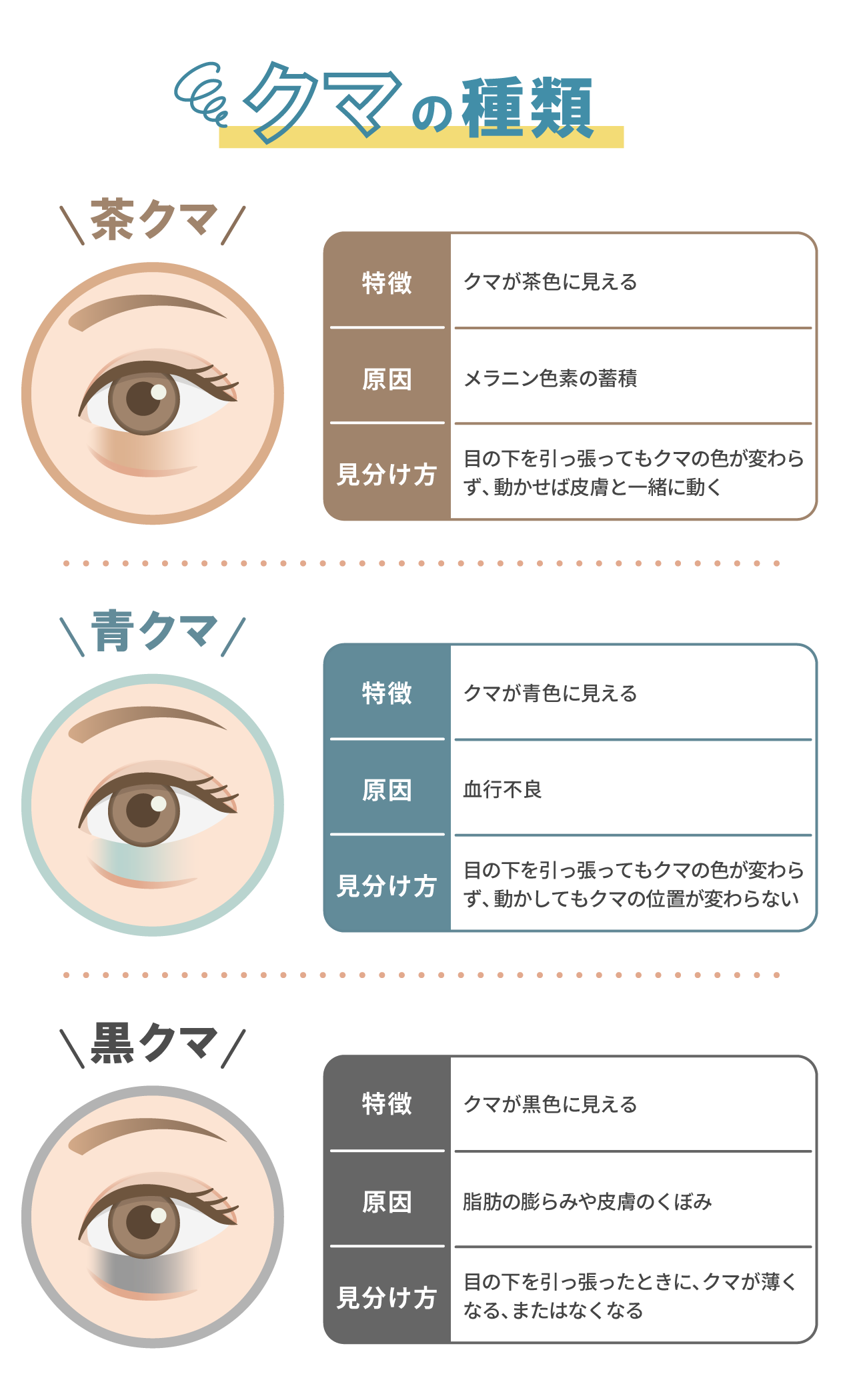 クマはおもに、茶クマ、青クマ、黒クマの3種類に分けられます。クマの種類によって、効果的な施術方法も異なります。