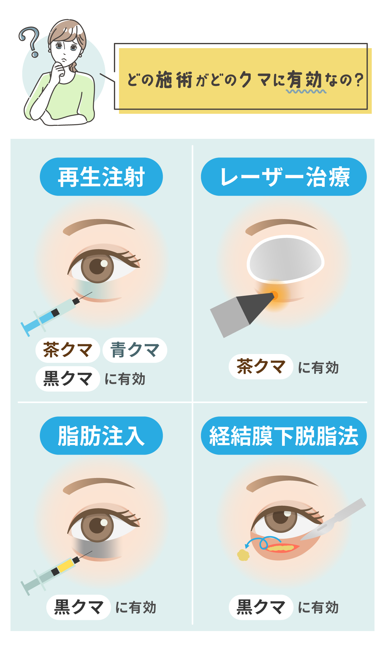 クマ取りの施術はおもに4種類!再生注射、レーザー治療、脂肪注入、経結膜下脱脂法