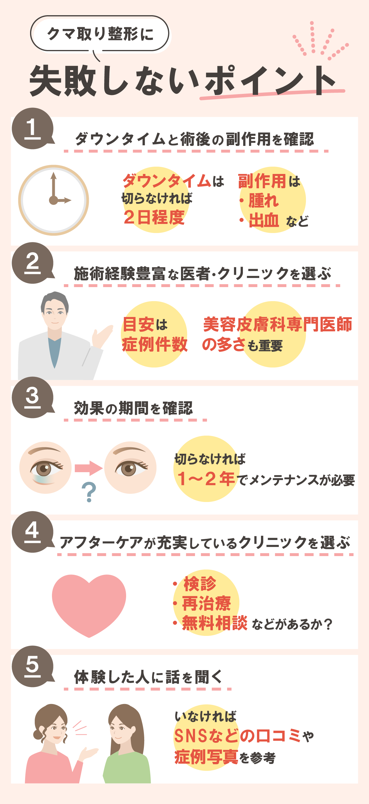 (クマ取り施術に失敗してしまうと)腫れや内出血、くぼみなどでクマが悪化して見えてしまう可能性が考えられます。