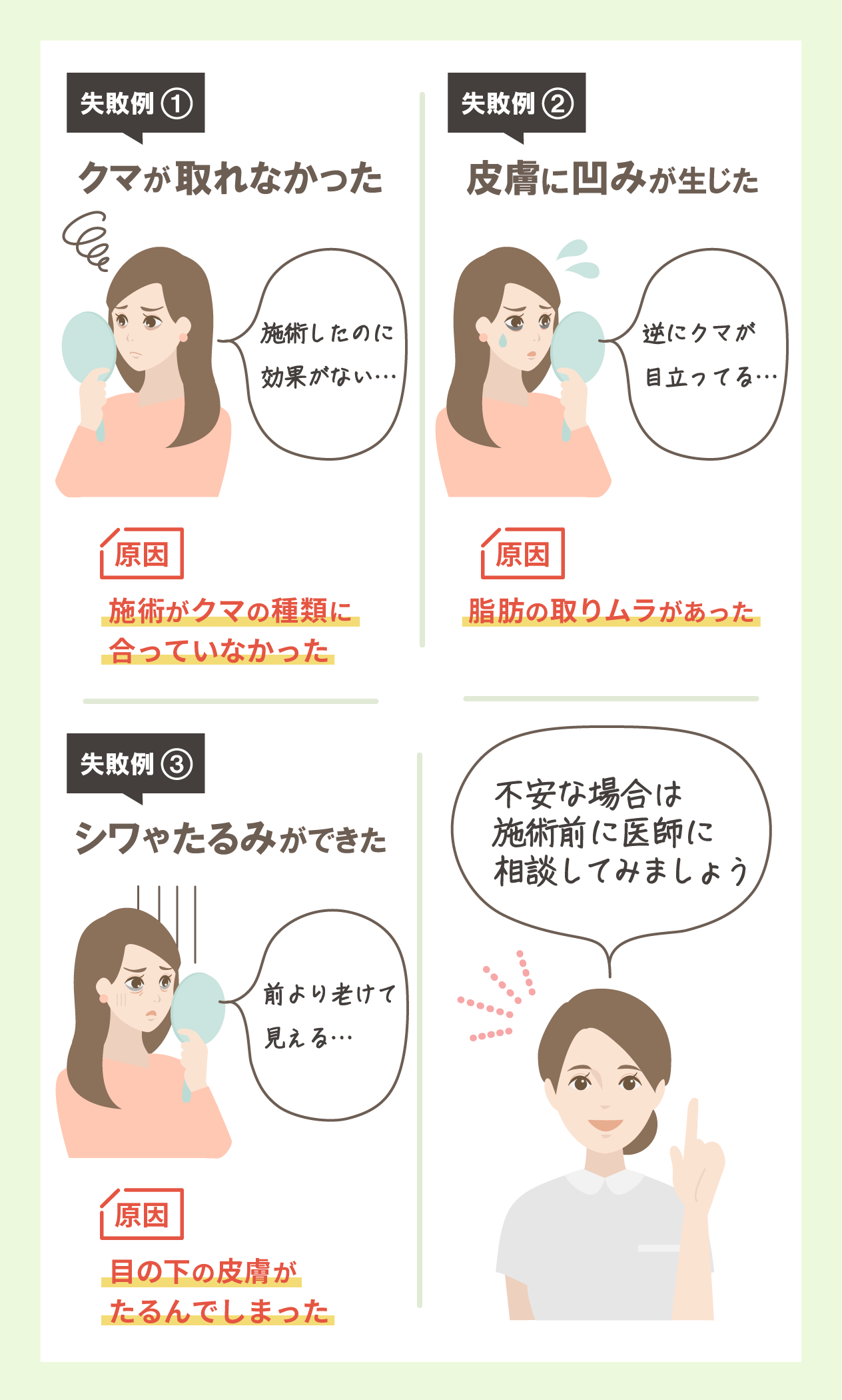 クマ取り整形をして必ずしも効果が得られるとは限りません。なかには、「クマが消えない」「クマが悪化してしまった」ということもあります。