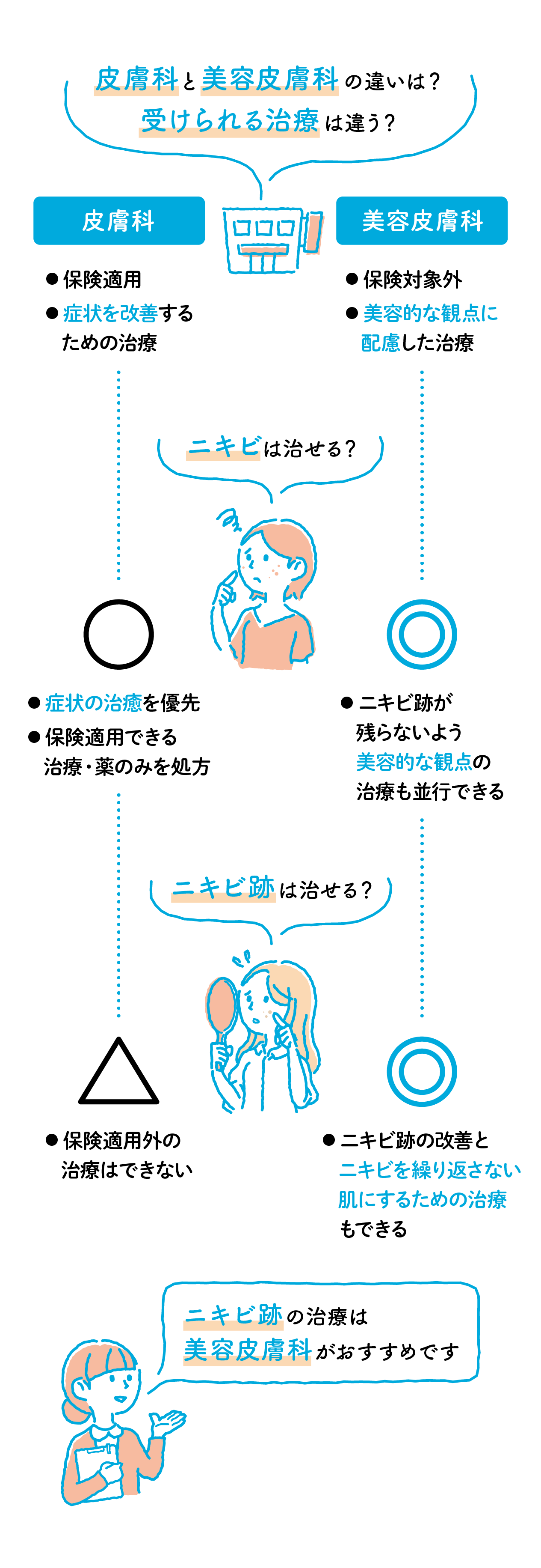 一方、美容皮膚科保険が適用されない自由診療です。美しさや若さといった美容的な観点から、ニキビ等の炎症が起こりづらいような肌質にするための治療を行うことができます。