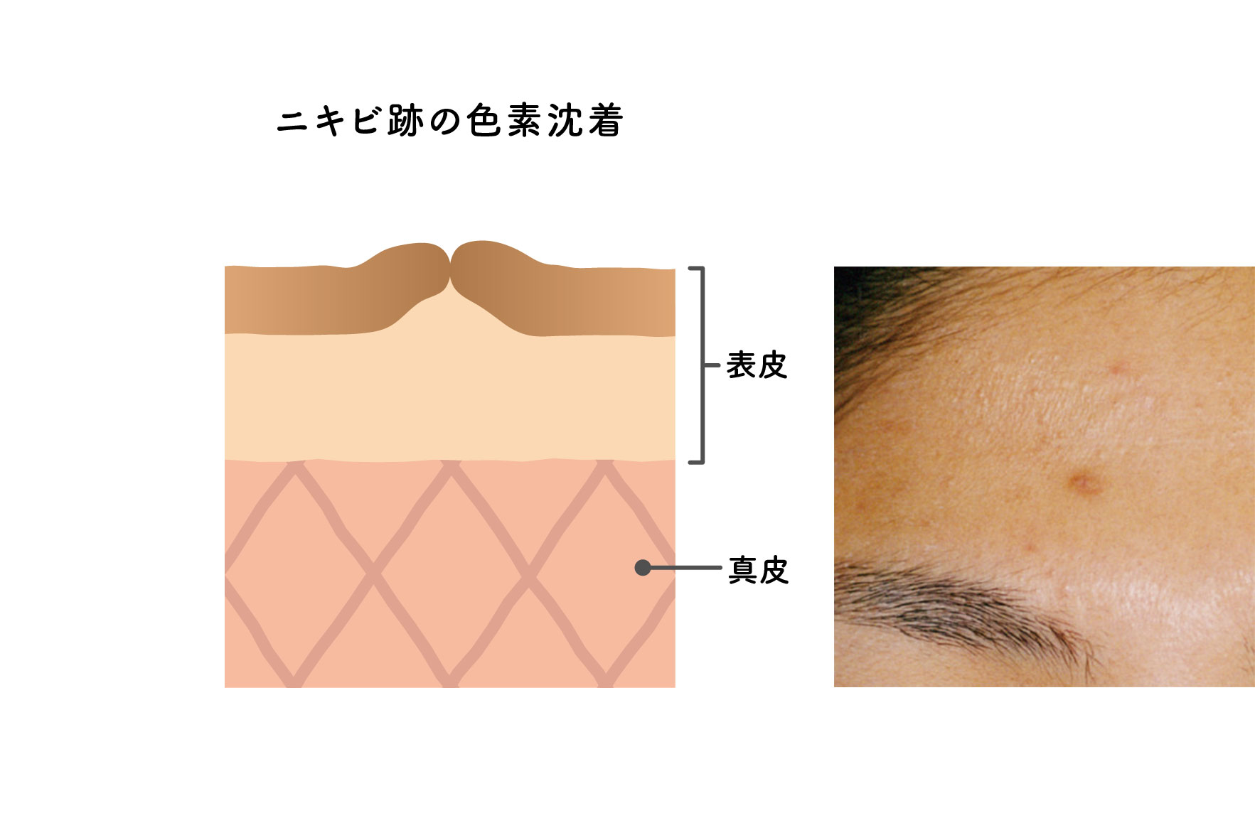 茶色い色素沈着は、ニキビの炎症によって発生する「メラニン色素」が原因です。ニキビの炎症が重症化すると、新陳代謝のスピードが遅い真皮の部分にも炎症が広がり、メラニンが発生します。