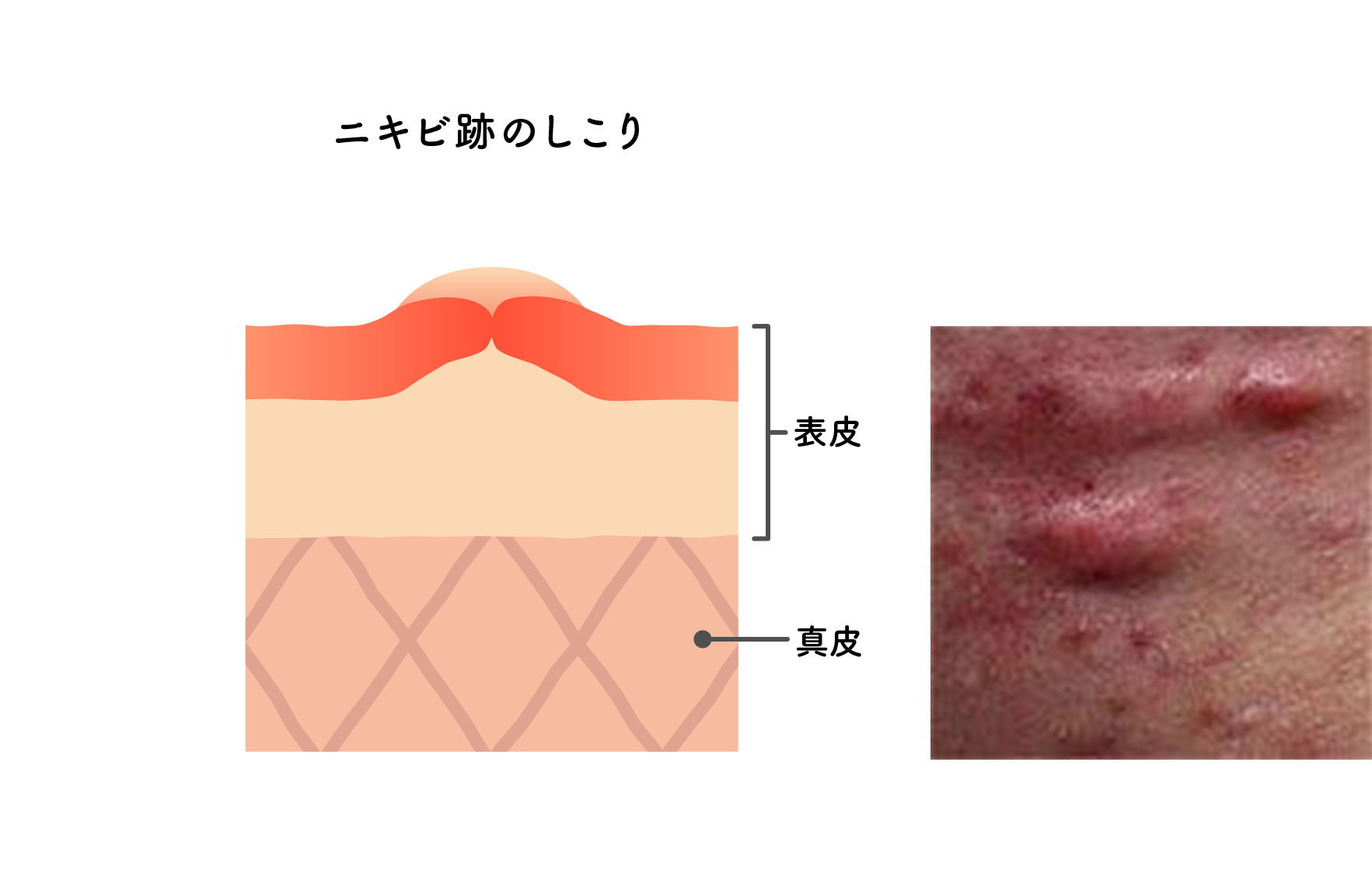 ニキビの炎症が悪化して真皮が大きなダメージを受け、修復をしようとして過剰に皮膚の細胞を作ることで表面が固く盛り上がった状態です。