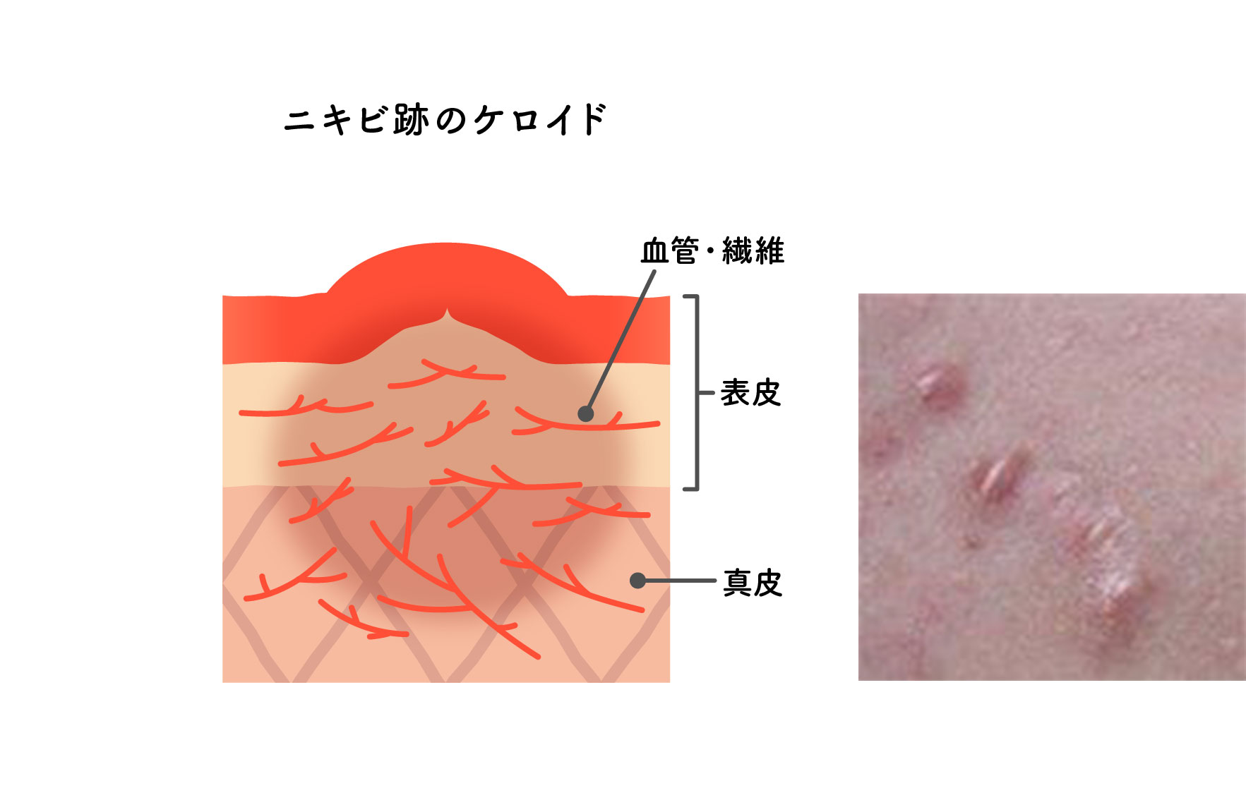 原因 ニキビを触ったり潰そうとしたため、真皮の中のコラーゲンが必要以上に作られ、ダメージを受けていない皮膚まで覆ってしまう
