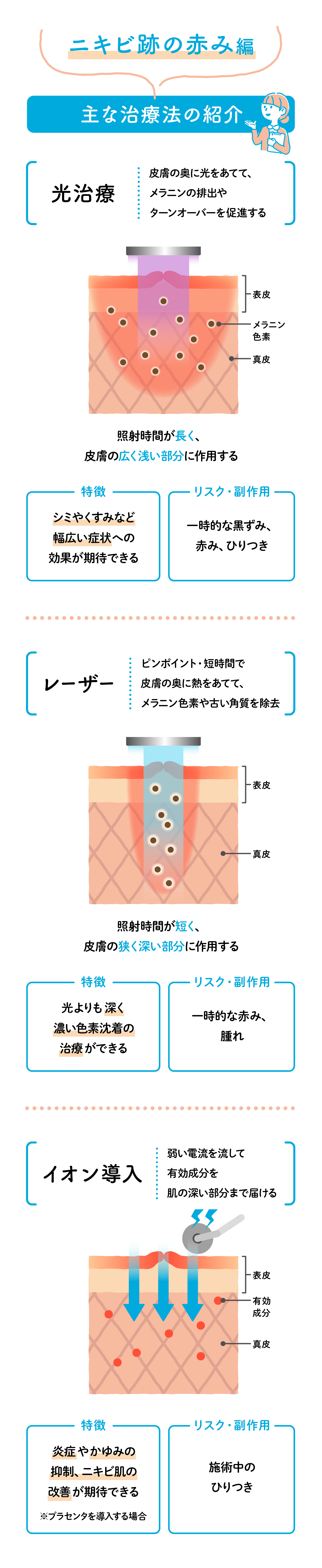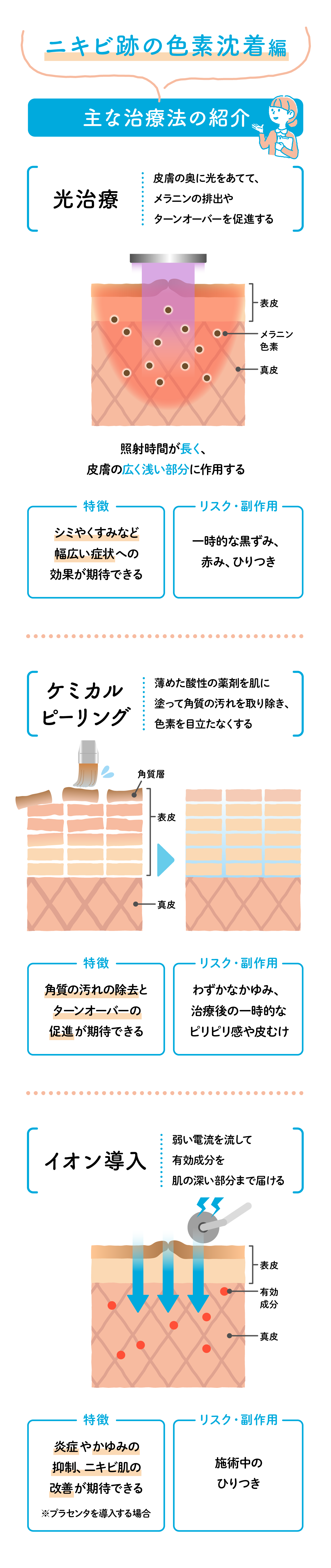 主な治療法 光治療、ケミカルピーリング、イオン導入