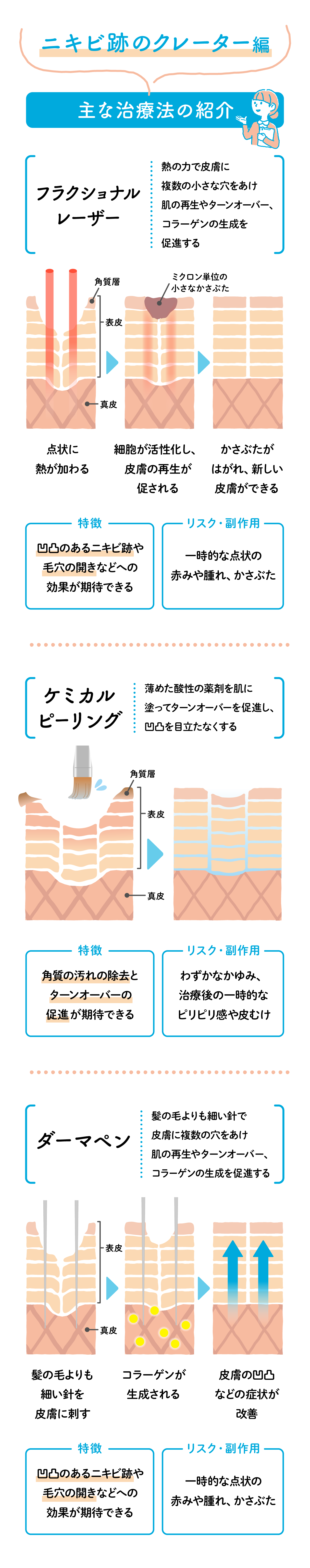 フラクショナルレーザーは熱を点状に肌に当てる、ダーマペンは非常に細い針で肌に穴を開ける、ケミカルピーリングは肌表面に薬剤を塗ることで、ターンオーバーを促して凹凸を目立たなくしていきます。