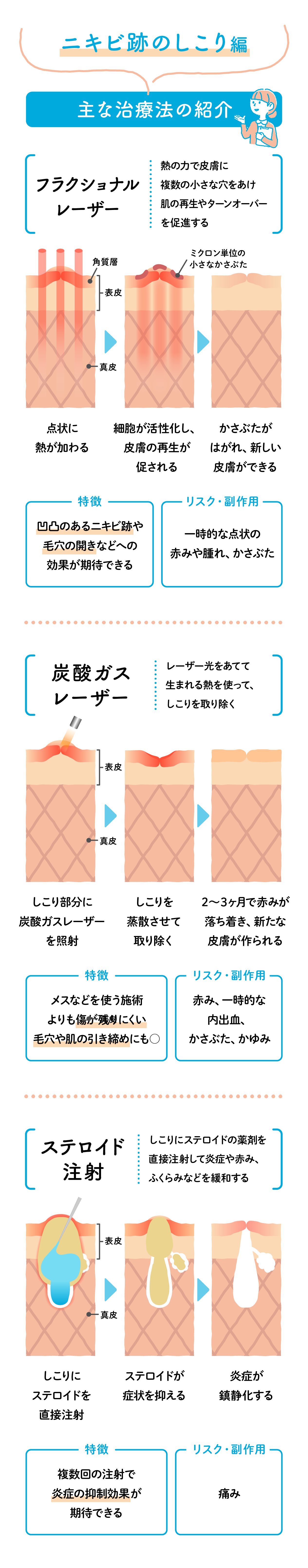主な治療法 フラクショナルレーザー、炭酸ガスレーザー、ステロイド注射