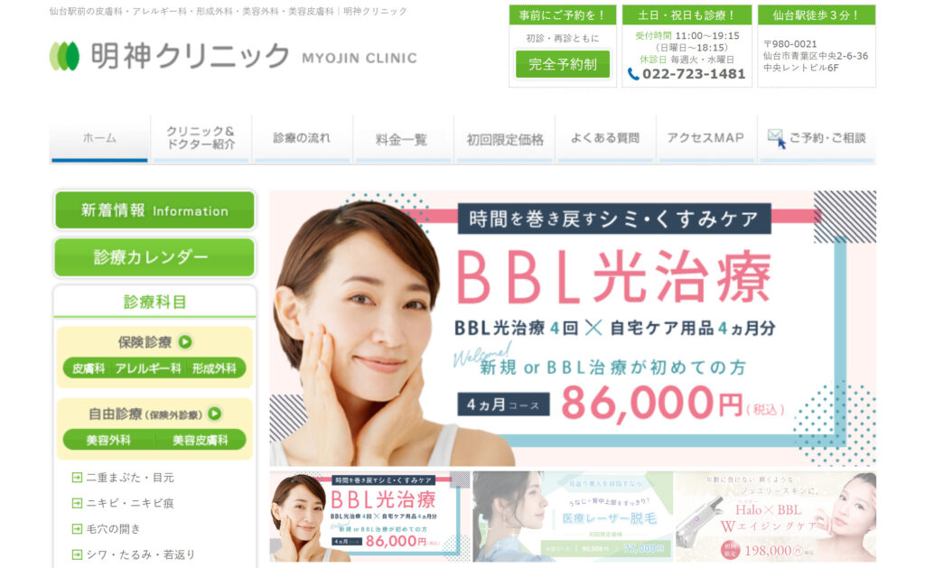 明神クリニックではニキビ跡治療として、ケミカルピーリングやBBL光治療などが用意されています。