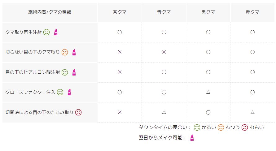 クマ取りと言えども一律の施術法ではありません。以下4種類に分類にされ症状も違います。同クリニックでは、それぞれの症状に合った施術法・ダウンタイム・メイクについてを提案することに重点を置いています。