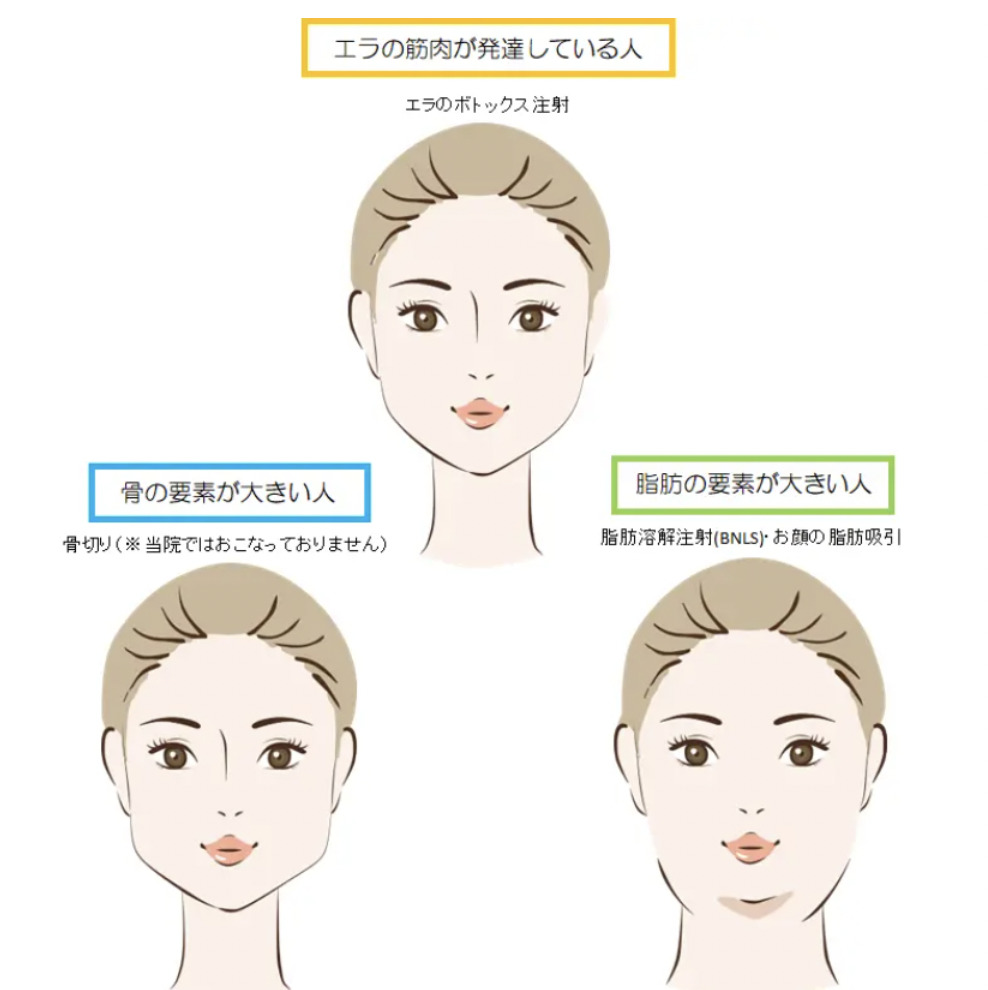 【脂肪が多いタイプ】の患者様は、ボトックス注入ではなく、脂肪溶解注射や脂肪吸引など、脂肪を減らす効果のある治療を選ぶべきでしょう。