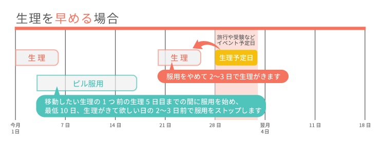 - 早めたい生理の1つ前の生理5日前までにピルを服用し始める