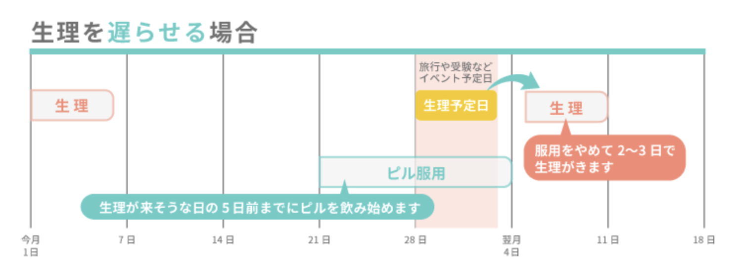 - ピルを飲み終えて5日以上経ってから生理が来るケースもあるため、そのような場合はさらにピルを飲んで生理を遅らせなければいけなくなる