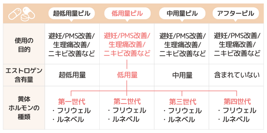 エストロゲンの含有量によって種類が変わる低用量ピルは、以下の4種類に分けられます。