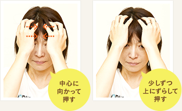 [tl label=’STEP.2′] 指の腹を使って、両手を寄せるように、中心に向かって押すようにします。この時、頭皮を押したまま2〜3秒キープして、ゆっくり下ろしましょう。 [/tl]