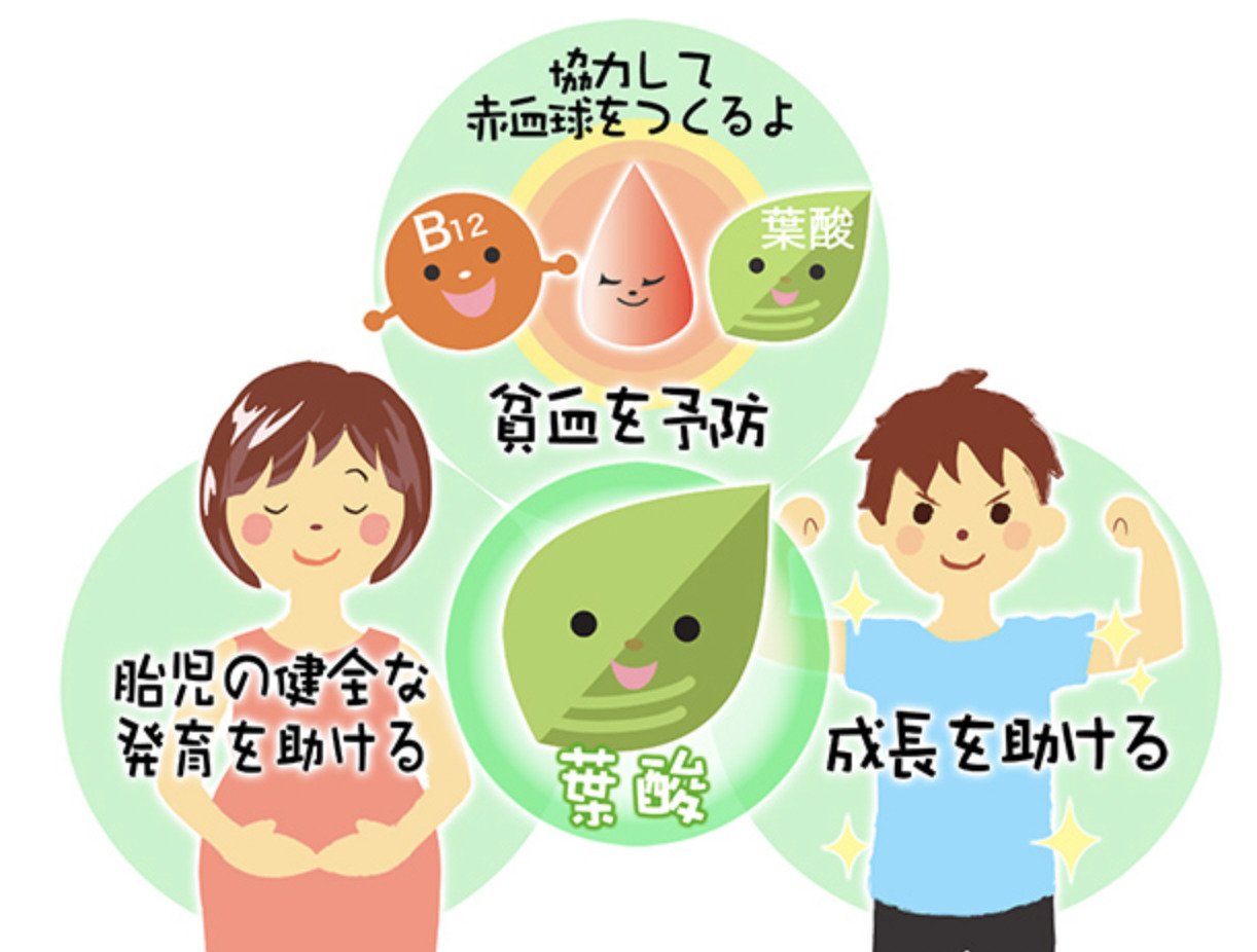 葉酸はビタミンB群の一種で代謝に関係し、細胞の生産や再生を助けて体の発育に役立ちます。細胞の分裂や成熟にも大きく関わるため、特に胎児にとっては重要な成分です。
