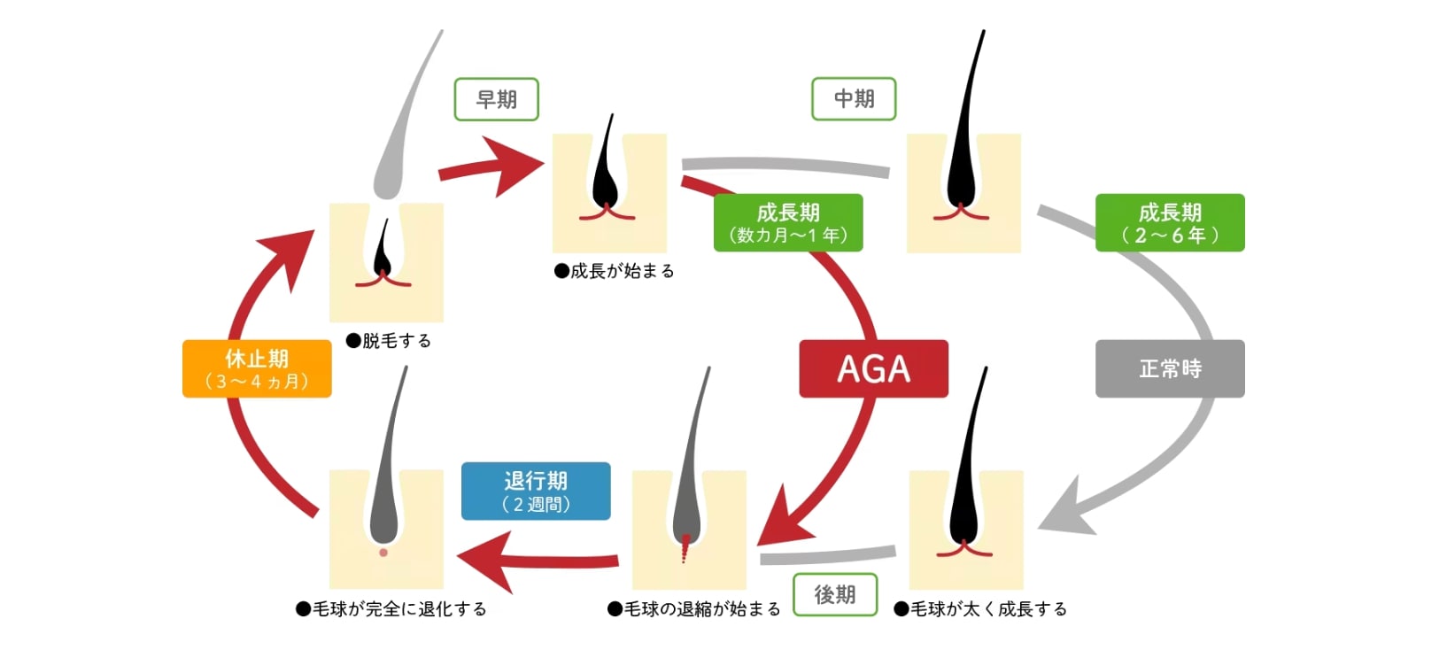 髪の毛が生え変わることをヘアサイクルといいます。AGAになると、へアサイクルが乱れ成長期が短くなり脱毛や細く短い髪の毛が増えて生え際や頭頂部の髪の毛の密度が減ります。密度が減ることで頭皮が見えるようになり、ボリュームもダウンし薄毛の状態になります。