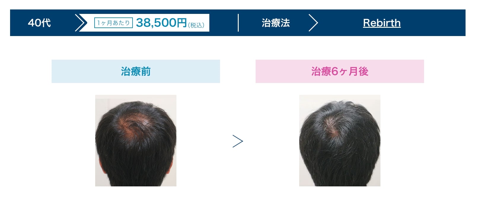 タブレット(内服薬)とリキッド(外用薬)を併用し、高い発毛効果を期待できます。タブレットで体の内側から発毛しやすい環境に体を整え、リキッドで直接毛根に発毛促進を働きかけます。Rebirth(リバース)は、体の内側・外側から同時に薄毛改善を図るAGAスキンクリニックのオリジナル発毛薬です。