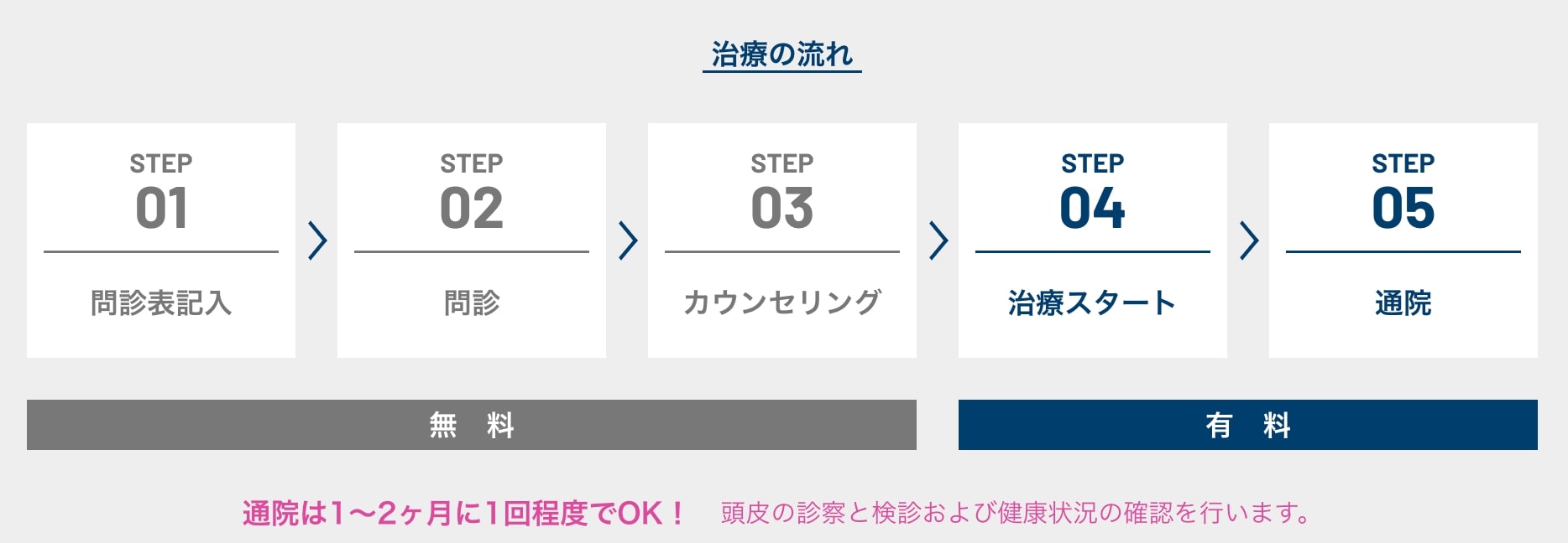 専門カウンセラーによるカウンセリングを受けます。毛根・頭皮の状態を更に詳しく見るため、頭皮チェックを行います。治療の内容や薬の種類、料金など詳細の説明を受けられます。