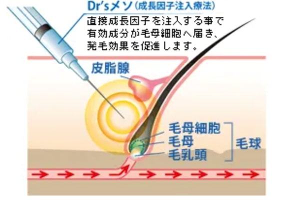 Dr’sメソ(AGAメソセラピー)の役割は、不足している発毛成長因子を補完し、止まってしまった成長シグナルを正常に戻すことです。発毛成長因子を補完する方法は、薄毛対策として注目を集めている方法です。