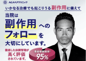 リスク・副作用:AGAメソセラピーは施術によって痛み、赤み、微細な出血が生じることがあります。 また、治療薬には動悸、一時的な血圧低下、初期脱毛、体毛の増加 等 が生じることがまれにあります。副作用については医師が詳しく説明させていただきますので、ご心配な点がありましたらお気軽にお聞きください。