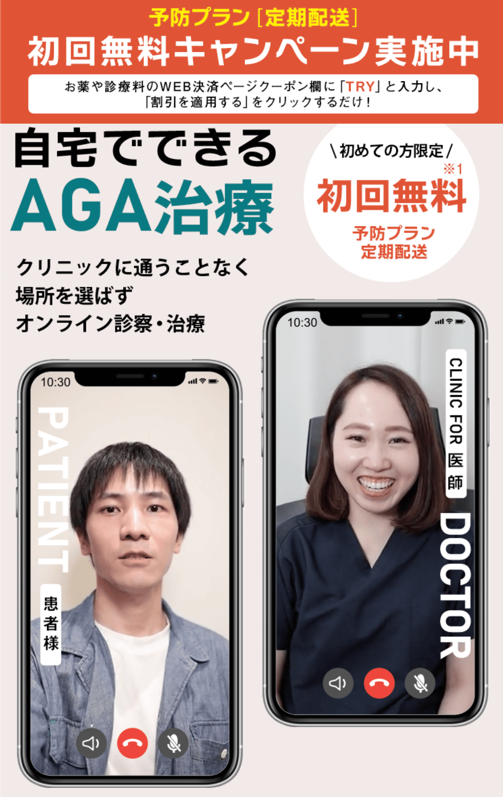 ※1 予防プラン/定期配送(フィナステリド錠)が初回無料キャンペーン実施中につき初月分のみお薬代が無料。2か月目以降は3,103円(税込3,412円)決済ページのクーポン欄に必ず「TRY」とご入力ください。未入力の場合は適用されません