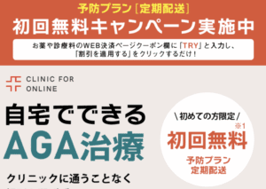 ※1 予防プラン/定期配送(フィナステリド錠)が初回無料キャンペーン実施中につき初月分のみお薬代が無料。2か月目以降は3,103円(税込3,412円)決済ページのクーポン欄に必ず「TRY」とご入力ください。未入力の場合は適用されません