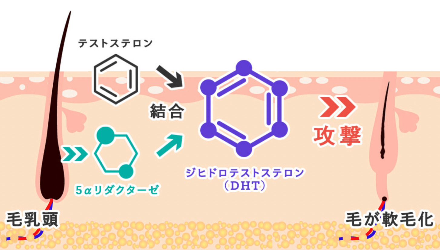 AGAは男性ホルモンが関わっています。男性ホルモンにあるテストステロンは、毛根にある5αリダクターゼと呼ばれる酵素によって、DHT(ジヒドロテストステロン)に変えられます。