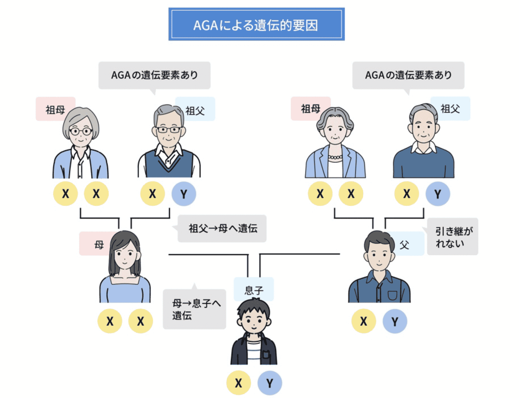 AGAなどの薄毛は、遺伝性が高いです。薄毛の遺伝子を持つとされているX染色体は、母方の祖父母・曽祖父の遺伝子も引き継いでしまいます。