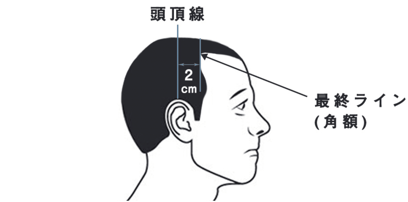 上記の絵のように耳の上部から頭頂部に向かって測り、後退している生え際の最終ラインとの距離が2cm以内になるとAGAと診断されることが多いです。