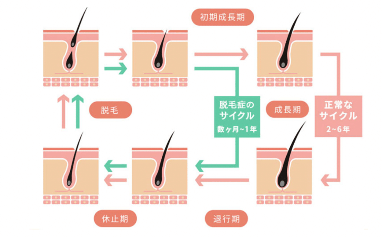 ヘアサイクルは毛が生えて抜け落ち、また生える毛周期のことです。通常、男性の場合3〜5年が1サイクルとなりますが、ヘアサイクルが乱れることで成長期なのに細い毛しか生えず、すぐに抜けてしまいます。