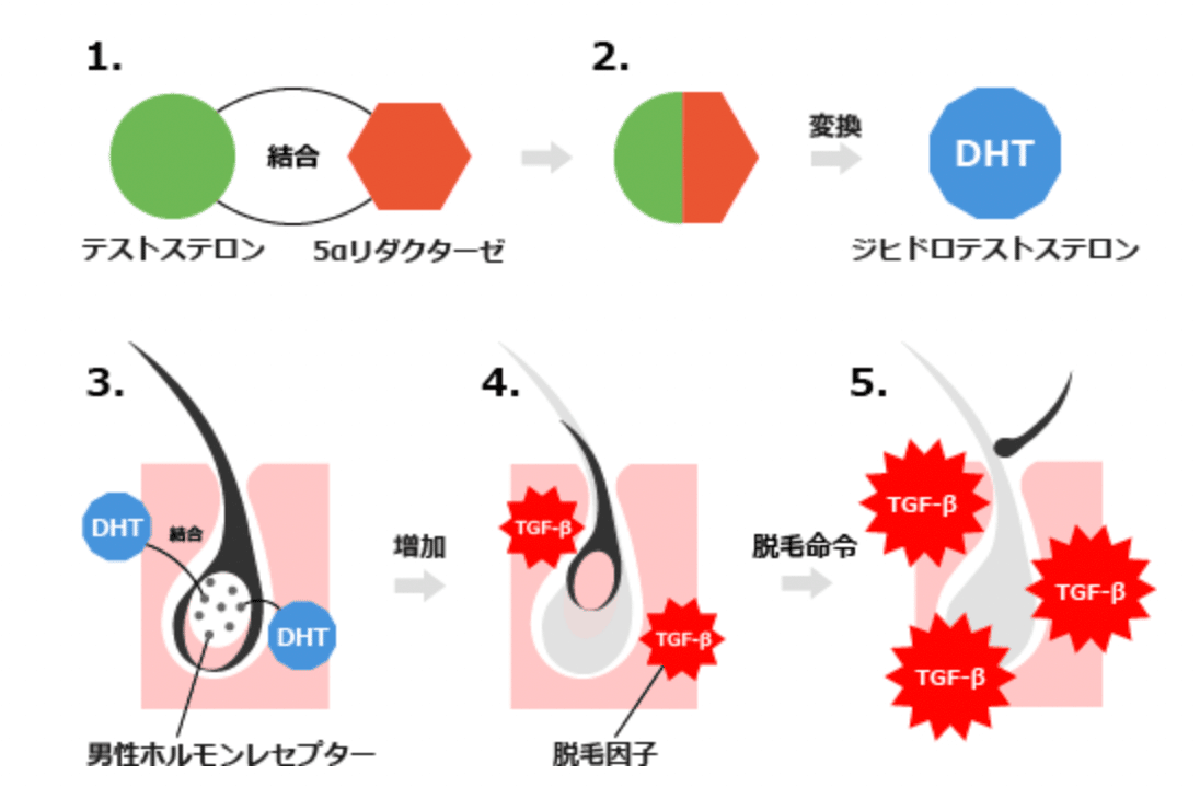 DHTは男性の成長過程に必要なものですが、多く生成されることで男性ホルモンレセプターと結合します。結合すると脳に「毛の成長を止める命令」を出してしまうのです。
