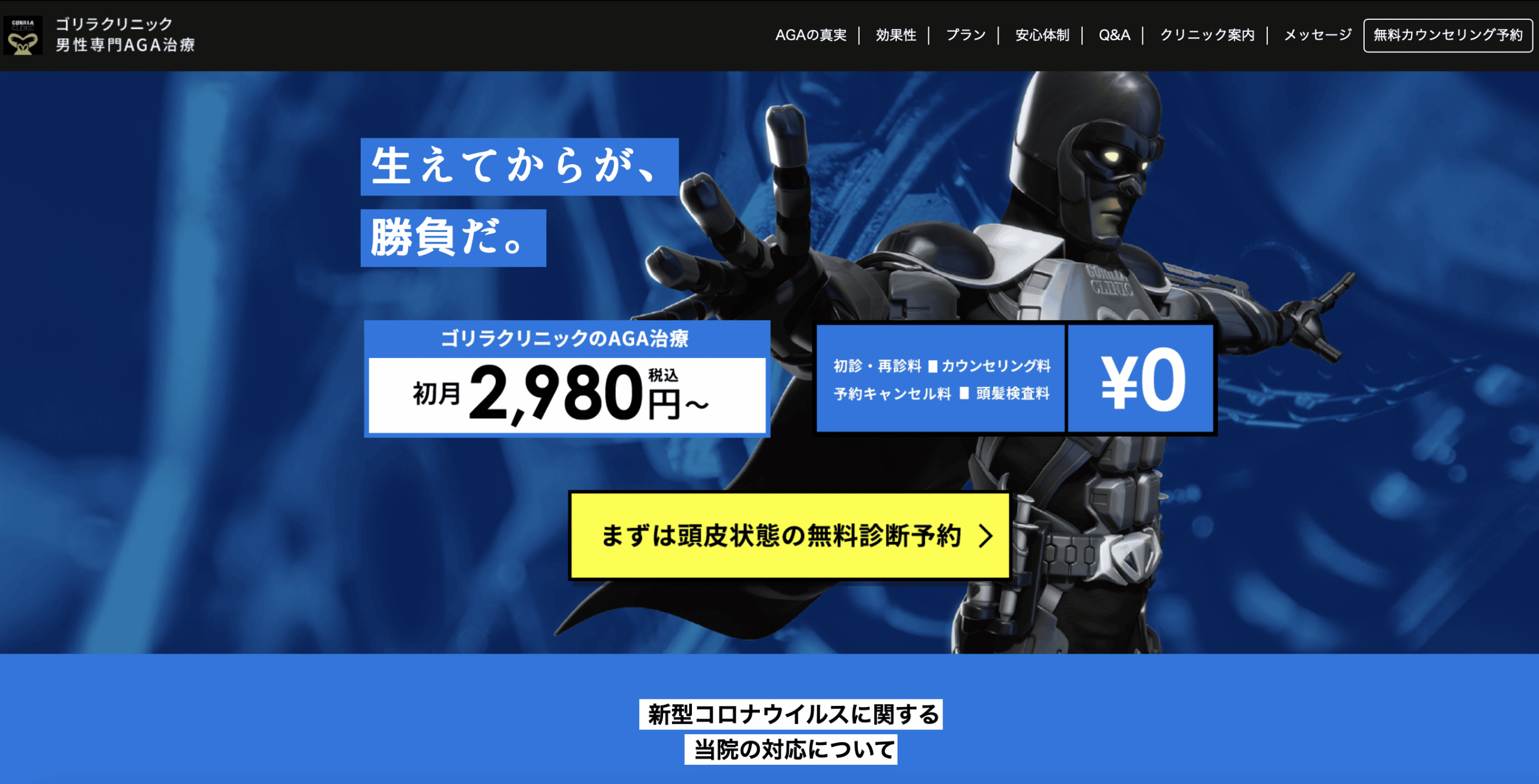 ゴリラクリニックは、男性専門の総合美容クリニックです。女性の目が気になっていて今までクリニックに通えていなかった方でもクリニックに通うことができますよ。また、医療機関でもあるので細部までこだわった治療をしてくれるのもおすすめ。