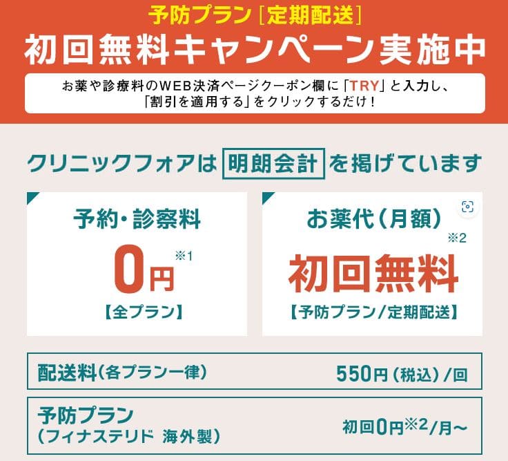 ※1 予防プラン/定期配送(フィナステリド錠)が初回無料キャンペーン実施中につき初月分のみお薬代が無料。2か月目以降は3,103円(税込3,412円)決済ページのクーポン欄に必ず「TRY」とご入力ください。未入力の場合は適用されません