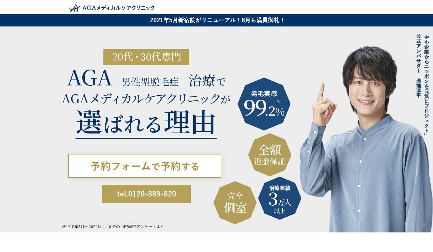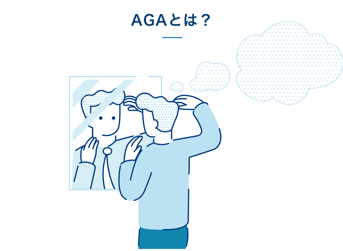 AGAとは男性ホルモン型脱毛症(男性型脱毛症)のことで、生え際や頭頂部の毛髪が薄くなってしまう脱毛症です。遺伝や男性ホルモンの影響が大きいとされており、改善のためにはAGA治療が必要です。