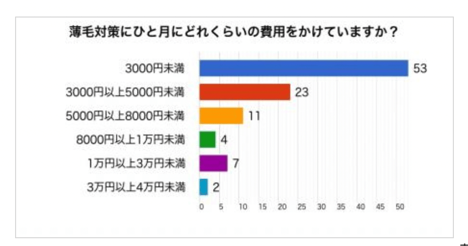 上記のグラフから見ても、できるだけ費用を抑えつつ薄毛対策をしたいと考えている人が多いようです。しかし、3,000円未満の人は、育毛剤やシャンプーなどで薄毛対策をしている人がほとんどでした。