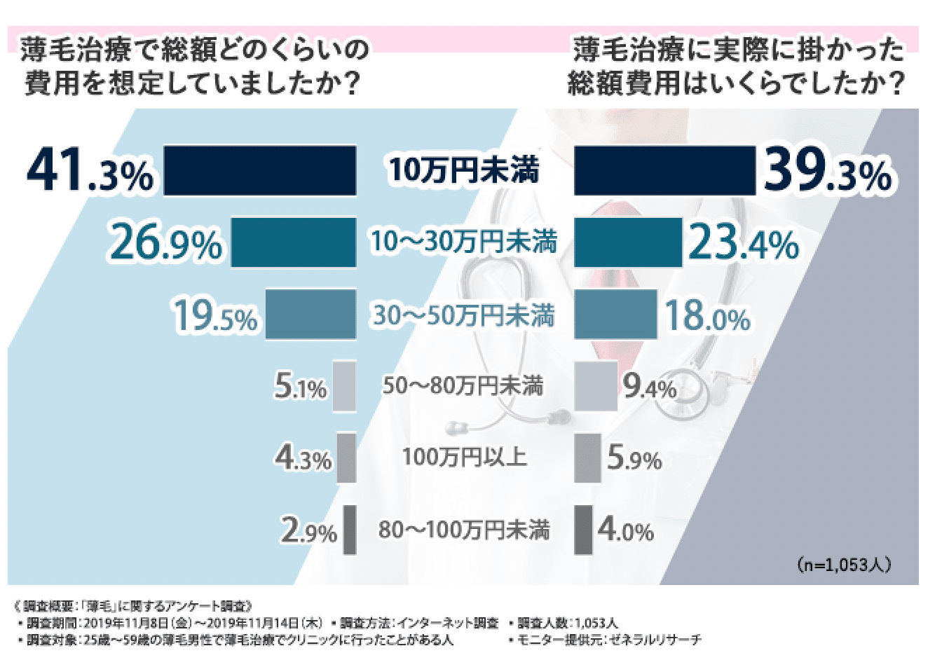 AGA治療にかかる費用は、想定の割合と実際の金額にそこまで差がありません。例えば、4割以上の方が100,000円以下で治療できると予想しているのに対し、実際にかかる費用も4割ほどの方が100,000円以下となっています。