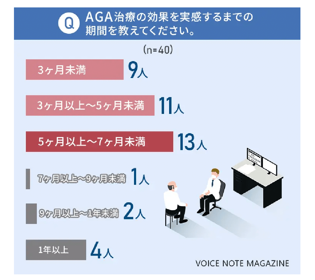 AGA治療の効果を実感するまでの期間は、平均して6カ月ほどです。早い人の場合3カ月ほどで効果を実感する場合もあり、効果を実感するまでには個人差があります。