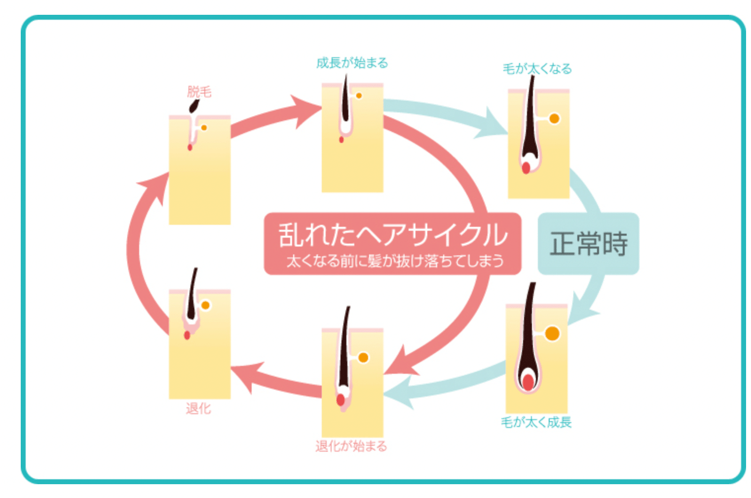 髪には毛周期(ヘアサイクル)があります。毛周期とは、髪が生えて抜け落ち、また生えてくる周期のことです。毛周期には成長期・退行期・休止期があります。