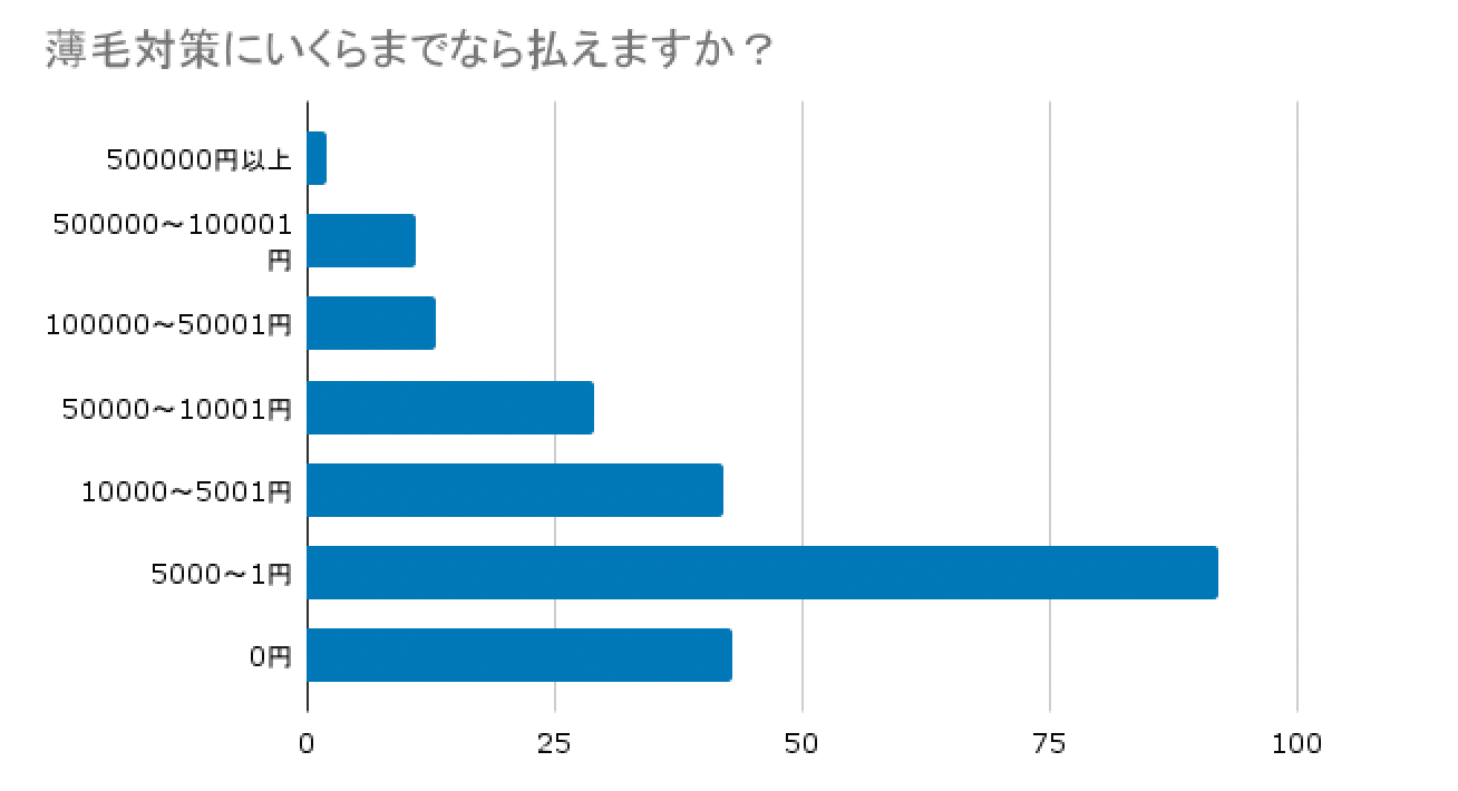 AGA治療はお金がかかります。AGA治療の相場は、月額15,000円〜30,000円です。上記のグラフを見ると、「薄毛治療に出せるお金は5,000円」という方が多くなっています。