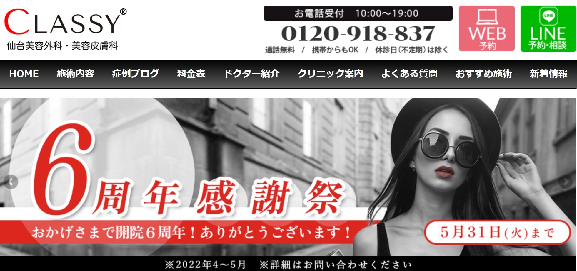 | クリニック名 | 品川美容外科 仙台院 | 東京中央美容外科(TCB) 仙台院 | 東京美容外科(TKC) 仙台院 | CLASSY 仙台美容外科・美容皮膚科 |