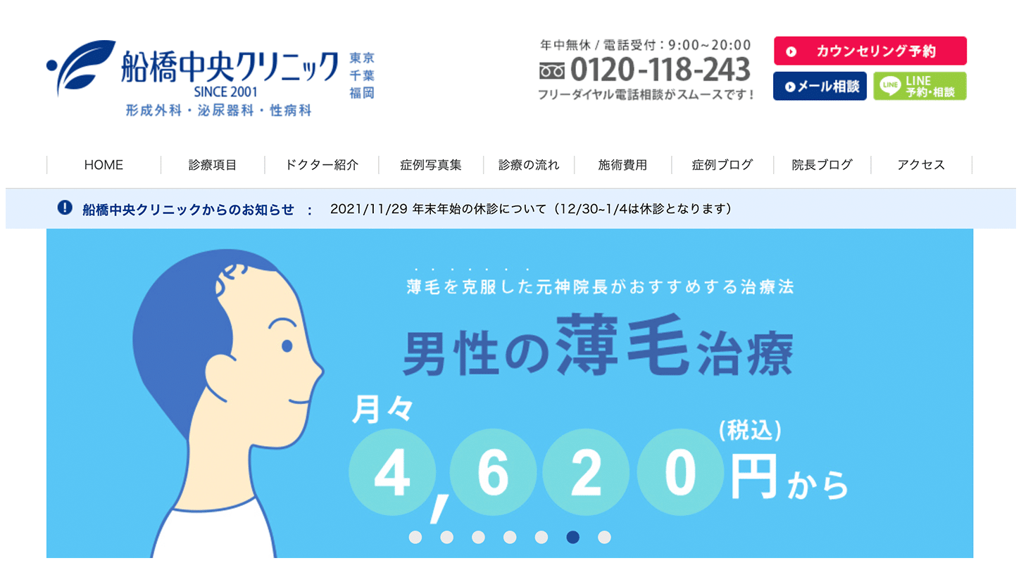 船橋中央クリニックのAGA治療では、年間で2,000件以上のAGA治療を行っています。豊富な症例数と経験があるので、AGA治療が初めての人でも安心して相談できます。豊富な症例はホームページに掲載されているので、施術を受ける前にイメージしやすいのは嬉しいですよね。