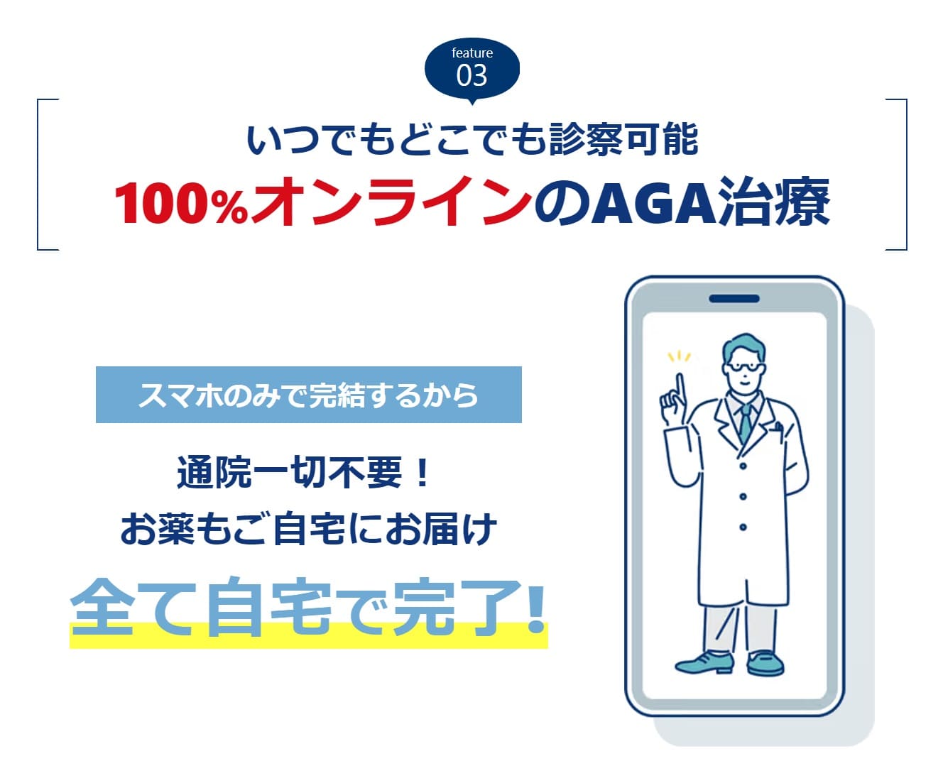 AGA治療のためにクリニックへ通うのが恥ずかしい人も多いでしょう。通うことを躊躇している間にAGAはどんどん進行してしまいます。早期治療のために便利なのがオンライン診療です。スマホなどで医師の診察が受けられ、自宅で全て完結できます。
