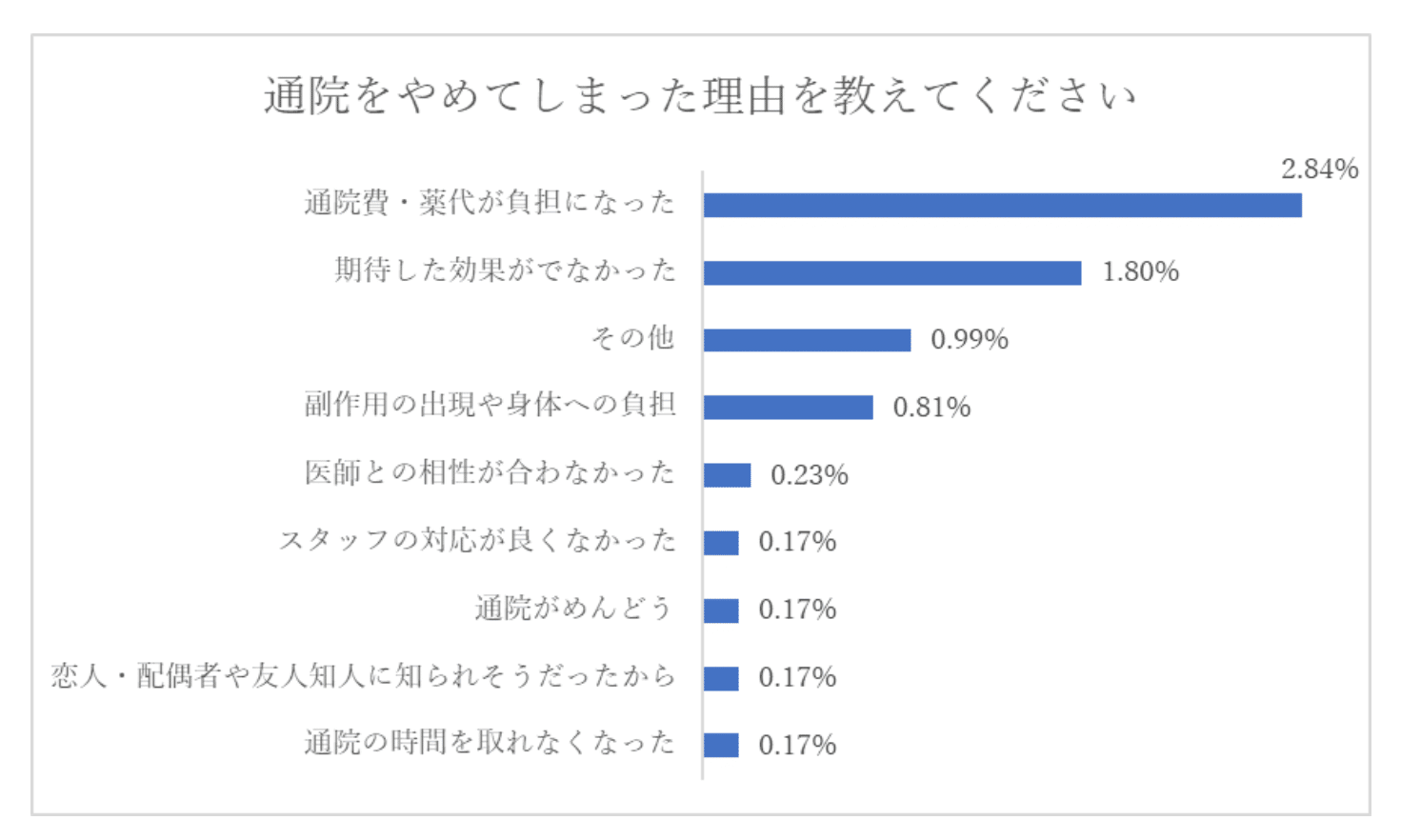 上記からわかるように、通院をやめてしまった大きな理由として、通院費や薬代が負担になってしまったことがあげられます。AGA治療を始めてから個人差はありますが、3〜6ヶ月頃から効果を感じることが多いので、それまでは継続する必要があるのです。