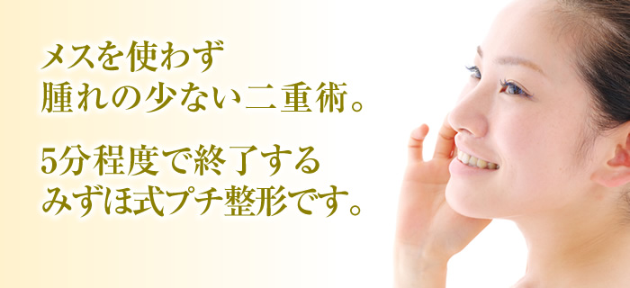 みずほクリニックは、二重整形の施術が最短5分で終了することができますよ。仕事が忙しい方でも二重整形が受けられるようになっていますよ。